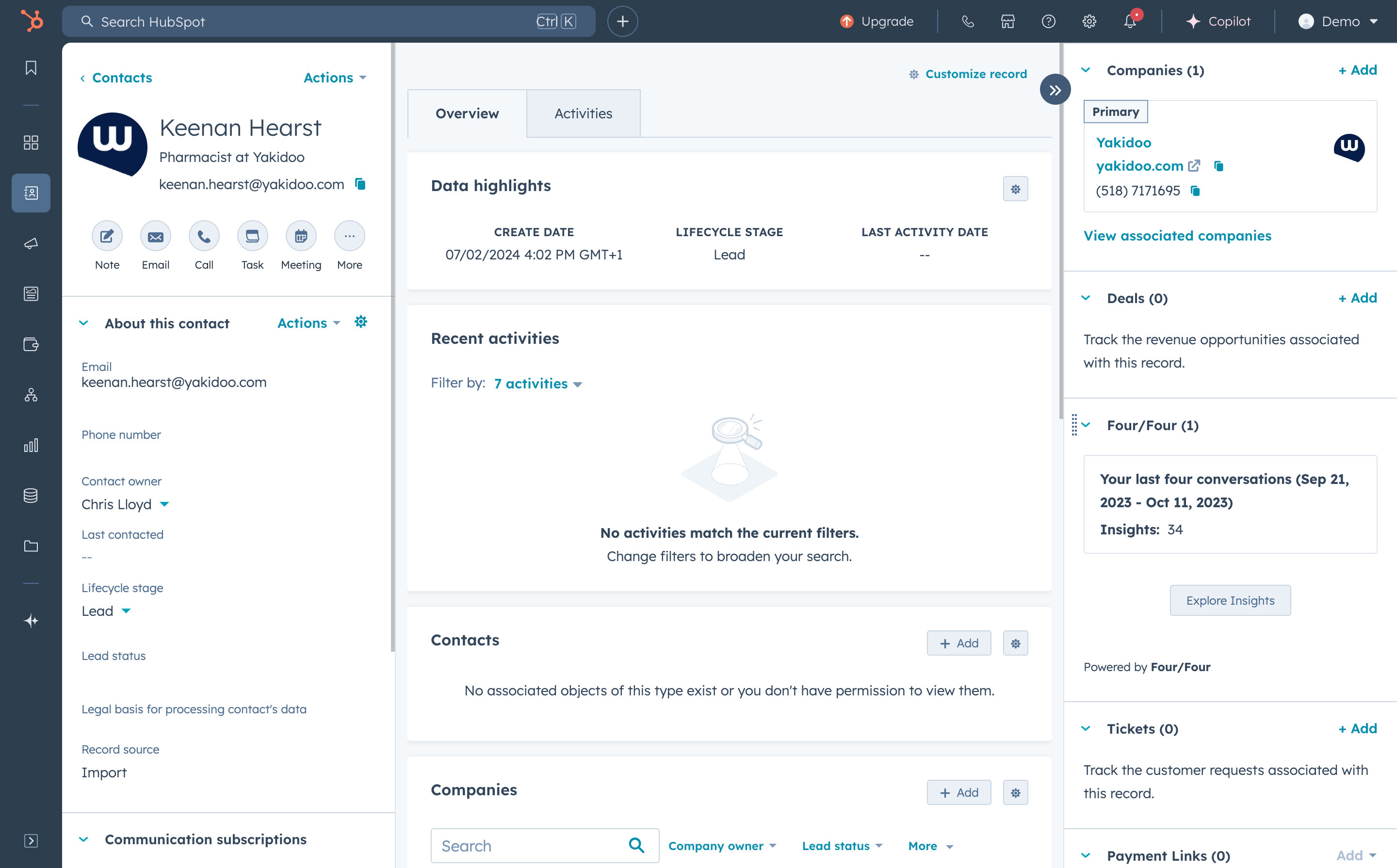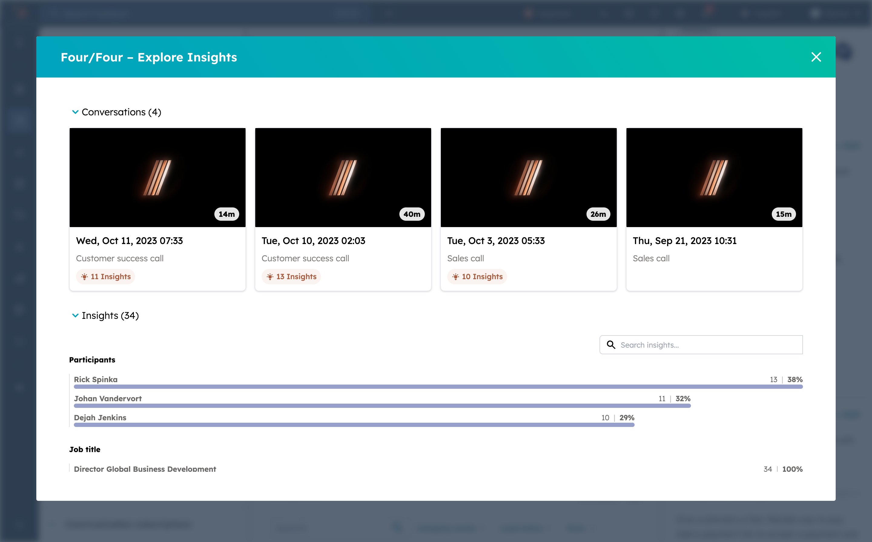 The Four/Four UI embedded within HubSpot elevates your CRM experience by displaying conversations and insights directly in your existing workflow. This embedded interface ensures that your team can access valuable information within the context of each customer record, fostering a deeper understanding of interactions and enabling more personalized and strategic follow-ups. By integrating seamlessly into the HubSpot environment, it streamlines processes and enhances efficiency for your sales and customer service teams.