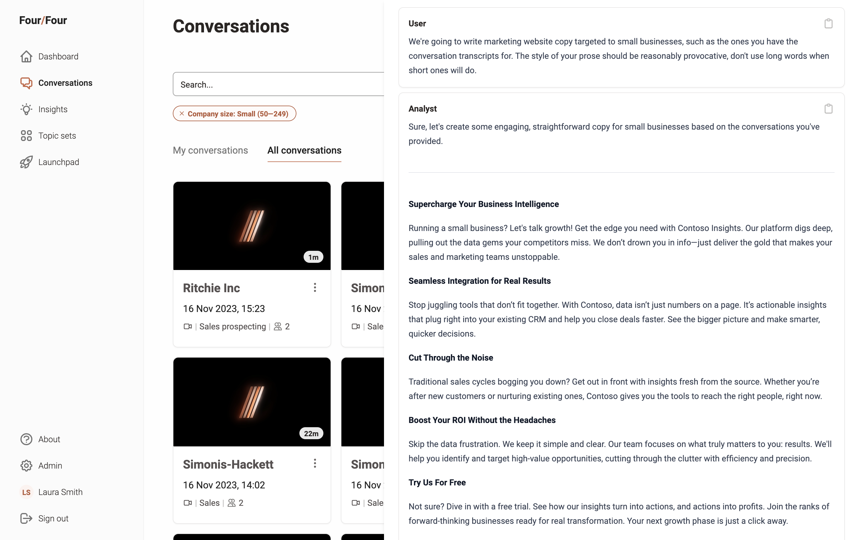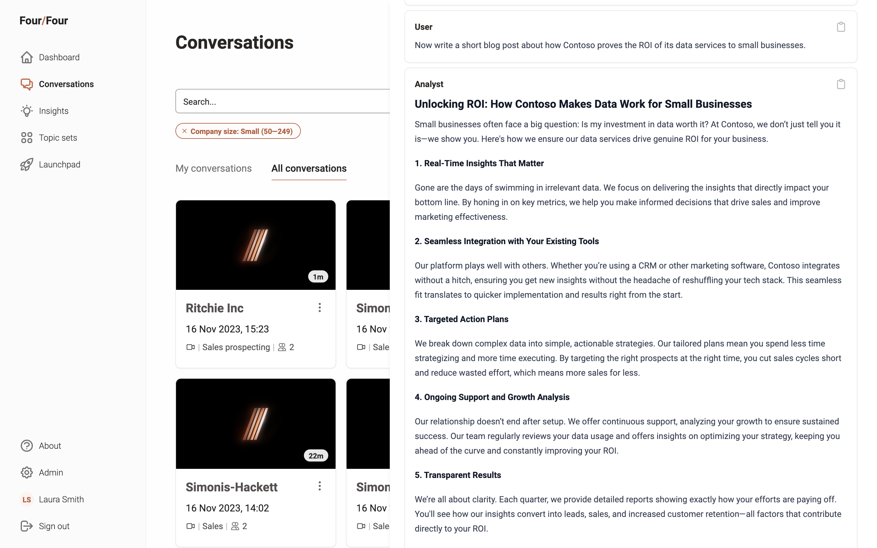 Keeping internal teams aligned is crucial for making fast, effective decisions. Four/Four’s "AI Analyst" can make this much easier by surfacing key updates and decisions from your company’s entire archive of meetings, customer conversations, and action items.