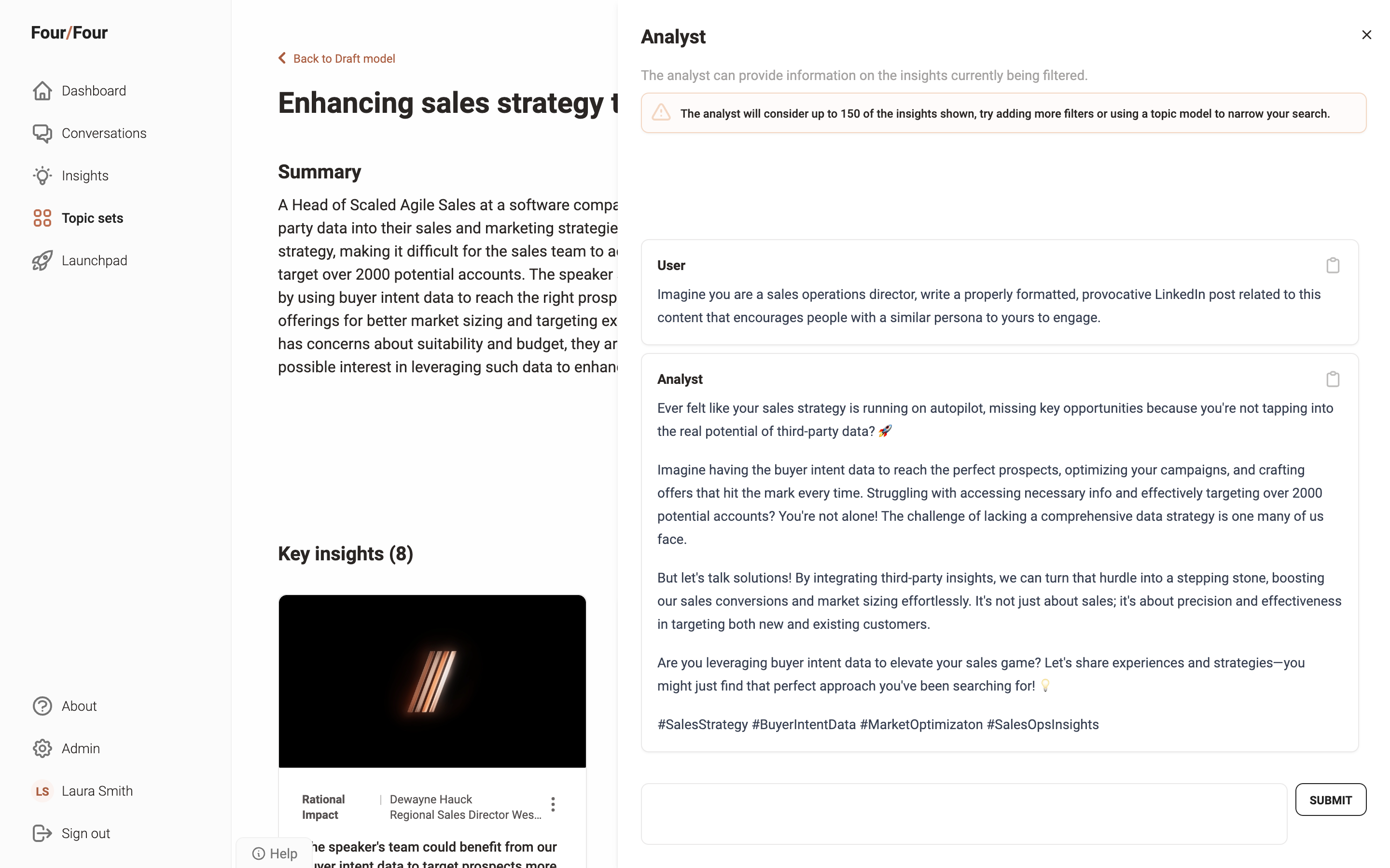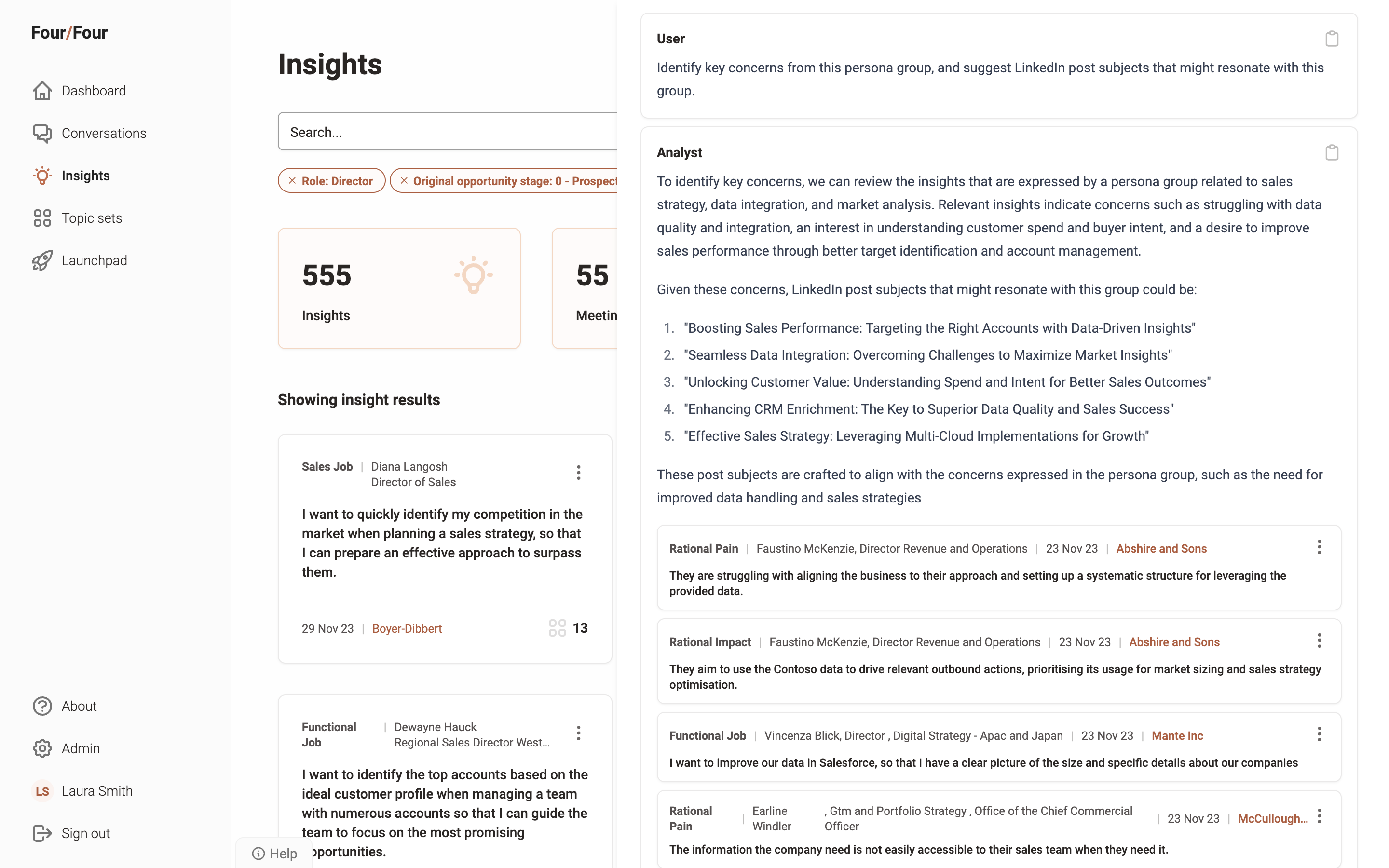 For example, imagine your CRM identifies a segment of healthcare providers interested in cybersecurity. You integrate Four/Four to pull in relevant data. Using CRM filters, you view conversations with these clients. Four/Four highlights their concern: secure patient data management. You can now refine your product features and messaging to focus on enhanced data security measures tailored for this demand.
