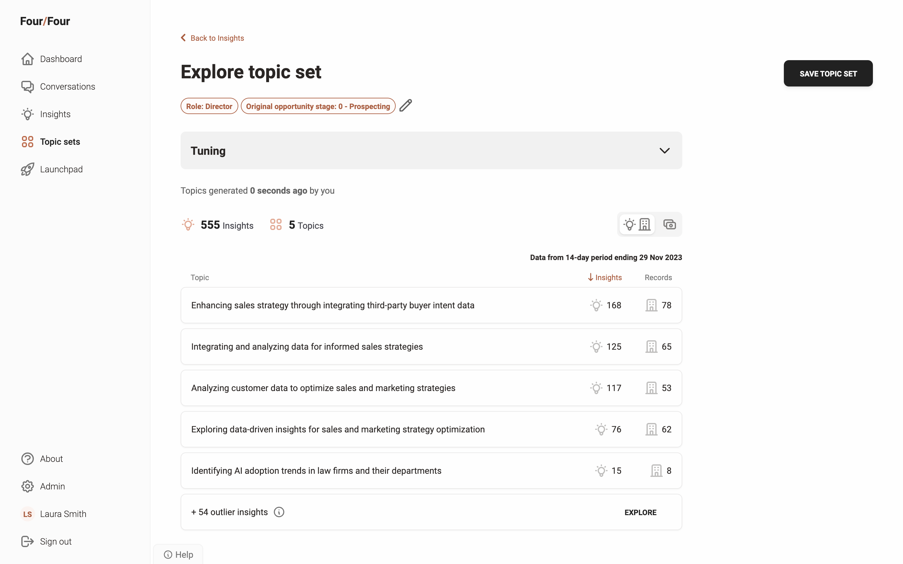 By integrating with your CRM, Four/Four pulls in essential firmographic data from accounts, opportunities, and leads, and connects this with the insights from your customer conversations. This means you can filter these conversations and insights using the same criteria and segments you already have set up in your CRM, creating a cohesive and seamless analysis process.
